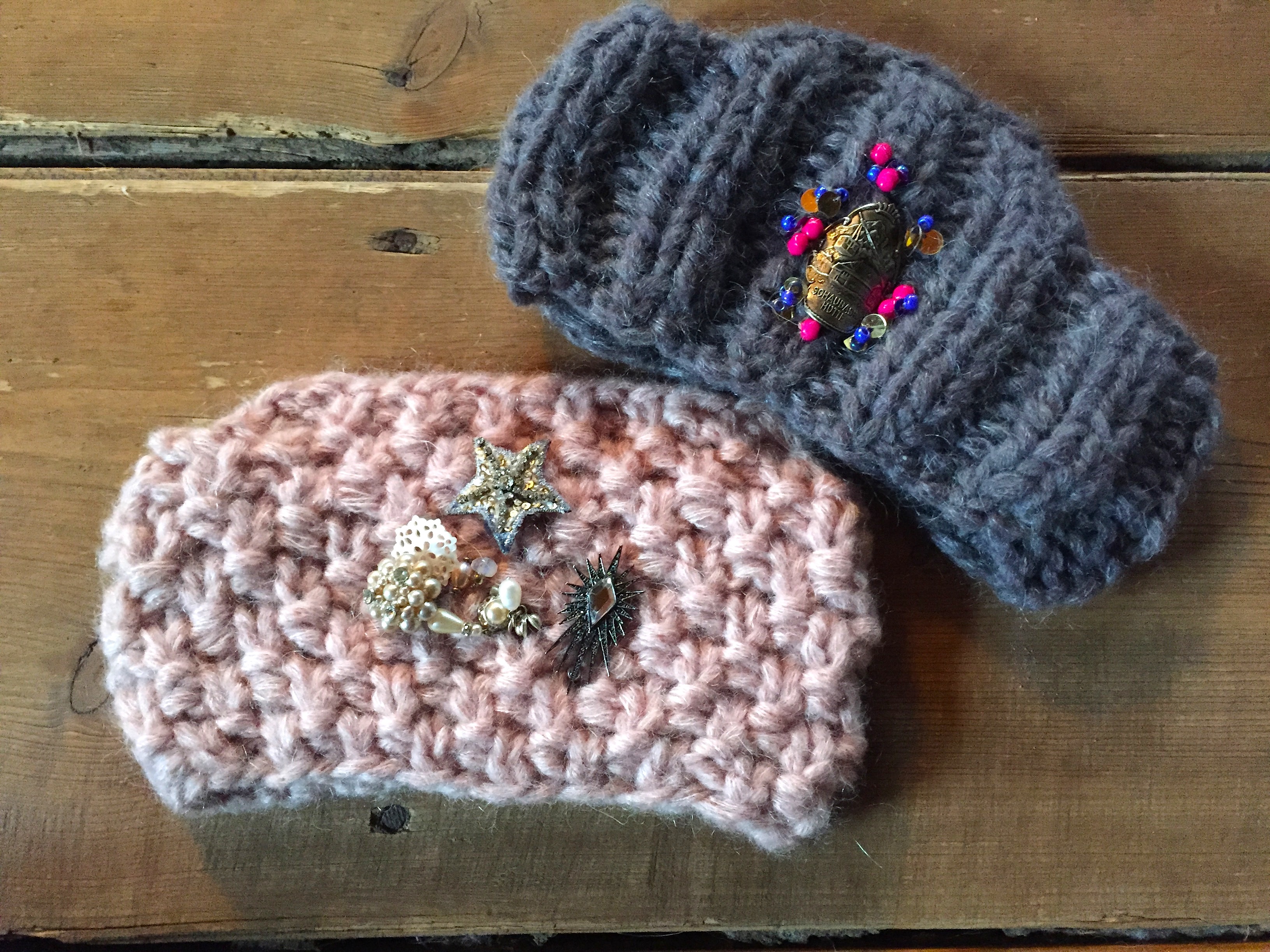 Sie sind weich, schnell gemacht, ein cooles Accessoire für kalte Wintertage – und eine wunderbare Beschäftigung fürs Wochenende. Ich habe die Stirnbänder mit bunten Perlen und Vintageschmuck, den ich zu Hause gefunden habe, verziert. Man kann alles benutzen, und sie auch jederzeit nach Lust und Laune neu personalisieren. Der Strassstein mit den „Strahlen“ ist zum Beispiel ein alter Ohrring, und auf das graue Stirnband habe ich eine Erinnerung an eine Wanderung auf die schöne Schaubachhütte in Italien angenäht.