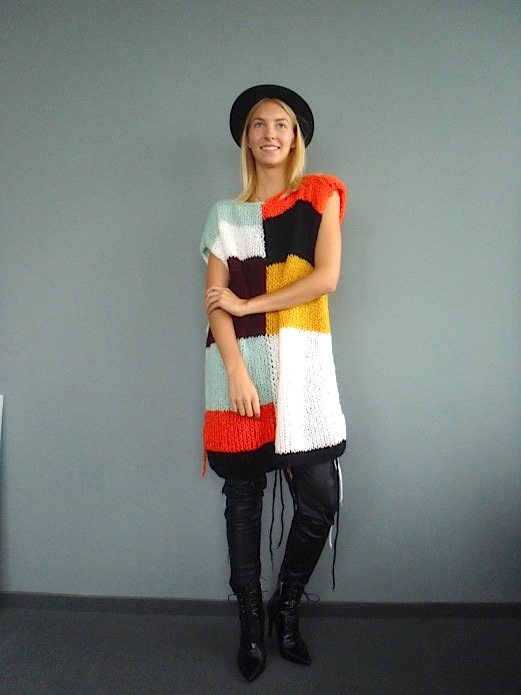 Erinnert ihr euch noch an mein Strickexperiment aus dem Zug? Das ist nun daraus geworden …….aus einem Pulli wurde ein Minikleid und mit Overkneestiefeln oder einer schmalen Hose ist es sogar tragbar. Mich haben die Farben angesprochen, die Kombi von sanft und laut wie hier das Orange mit Hellblau.
